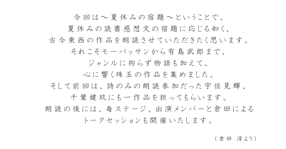 | 9月2日(日) | 13:00 | 『言葉の奥ゆき 通(アゲイン)』~夏休みの宿題~ <朗読&詩>笠原浩夫 <朗読&詩>仲原裕之 <朗読&詩>千葉健玖 <詩>吉成奨人 <詩>前木健太郎 <MC>倉田 淳 |