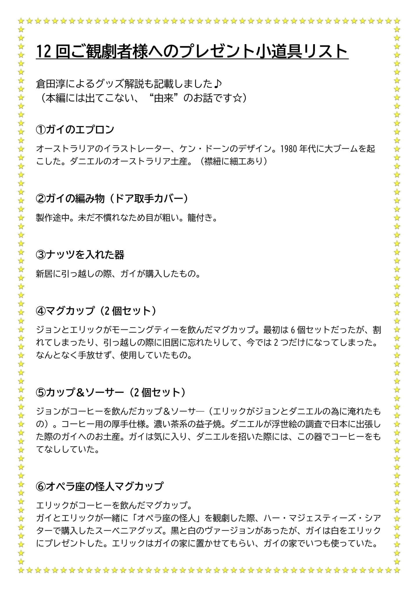 12回(全ステージ!)で本番で使用した小道具1点(下記候補リストからお好きな品をお選びいただきます)